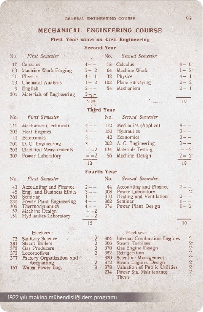 1912 yılında eğitime başlayan Makina Mühendisliği Bölümü, Robert Kolej mühendislik okulunun ilk kurulan bölümlerindendir. İlk yıllarında bölümün idari ofisleri, derslikleri ve laboratuvarları Gates Hall’da bulunmaktaydı. Bu binanın mimarı Michigan Üniversitesi Makina Mühendisliği Bölümü’nden Prof. Dr. John R. Allen olup binaya Robert Kolej'in üçüncü rektörü Caleb Gates'in adı verilmiştir. Allen hem mühendislik okulu binasının yapımıyla ilgilenmiş hem de ilk öğretim programının hazırlanmasında çalışmıştır. Ancak Allen Michigan Üniversitesi’nden sadece 1910-1912 yılları arasında izin almış olduğundan ders programına son şeklini vermesi için görevini Purdue Üniversitesi’nden Lynn Adolphus Scipio’ya devretmiştir. Scipio Robert Kolej’e 30 yılı aşkın bir süre hizmet ederek hem ders programlarının geliştirilmesi, hem öğretim üyelerinin alımı, hem de laboratuvarların kurulması aşamalarında çalışmıştır.